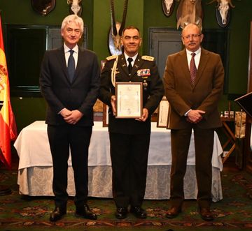 Acto de nombramiento de Miembro Agregado de las Fuerzas Armadas y de Seguridad Iberoamericanas de la Fundación Carlos III, al Coronel D. Juan Gabriel Giraldo Castañeda, Agregado Militar de Colombia ante el Reino de España. Entregan el Mayor General D. Edgar Mauricio Falla Vargas, Agregado de Defensa y D. Arturo Fernández Álvarez, Presidente de la Fundación Arturo Fernández Cantoblanco.