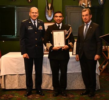 Acto de nombramiento de Miembro Agregado de las Fuerzas Armadas y de Seguridad Iberoamericanas de la Fundación Carlos III, al Capitán de Navío D. Ramón Armando Guerrero Baca, Agregado Naval de México. Entregan D. Arturo Fernández Álvarez, Presidente del Grupo Arturo Cantoblanco, y el General D. Arturo Meza Hernández, Agregado de Defensa de México.