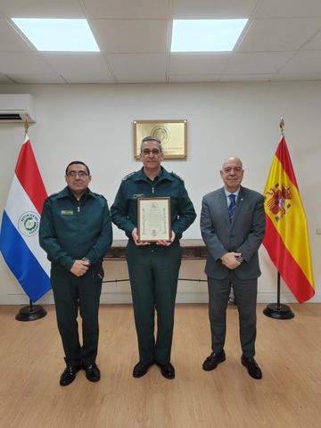 Acto de nombramiento de Miembro Agregado de las Fuerzas Armadas y de Seguridad Iberoamericanas de la Fundación Carlos III, al Coronel, D. Andrés Bareiro Morinigo, Agregado de Defensa de la República del Paraguay. Entregan el General D. Juan Antonio Díaz Cruz, anterior Director General de Protección Civil y Emdergencias y D. Jorge Echevarría Mendicuti, Miembro de la FCIII.