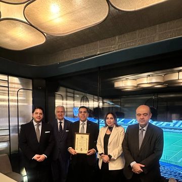 Don Mario Roberto Faraj, Presidente de la Fundación DIUNSA. Entregan D. Carlos Escudero de Burón, Presidente de la FCIII, y D. Julio González Ronco, Director General de la Fundación Real Madrid. Acompañan su esposa, Doña Leyla de Faraj, y D. Mateo Figueroa Tobón, Jefe Responsable del Área de América de la Fundación Real Madrid.